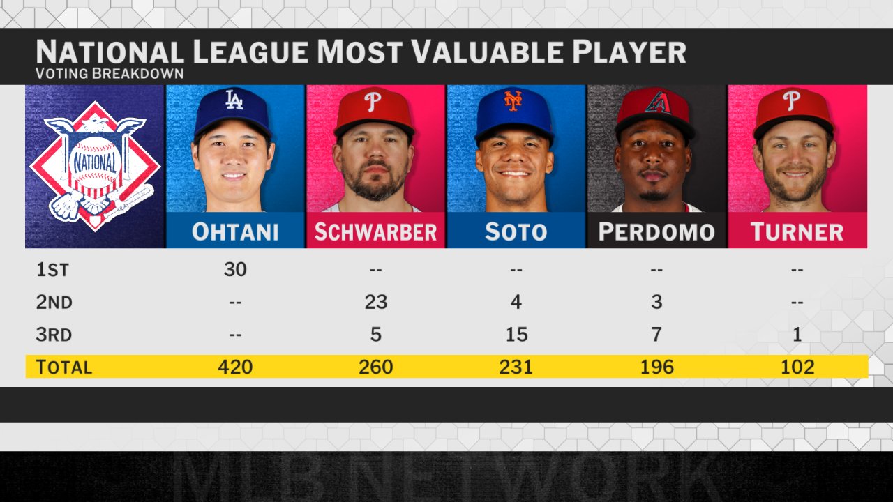 今年のナ・リーグMVPは最終候補者として、本塁打&打点で2冠のカイル・シュワーバー(32、フィリーズ)、43本塁打(リーグ3位)で盗塁王を獲得したメッツの主砲フアン・ソト(27)が残った。この日MLBネットワークの番組内で結果が発表され、ワールドシリーズで激闘を見せたブルージェイズのベンチコーチ、D.マッティングリー氏が「ショウヘイ・オオタニ」と発表。中継で登場した大谷は、横の真美子夫人と笑顔で顔を見合わせて、デコピンにキスをした。