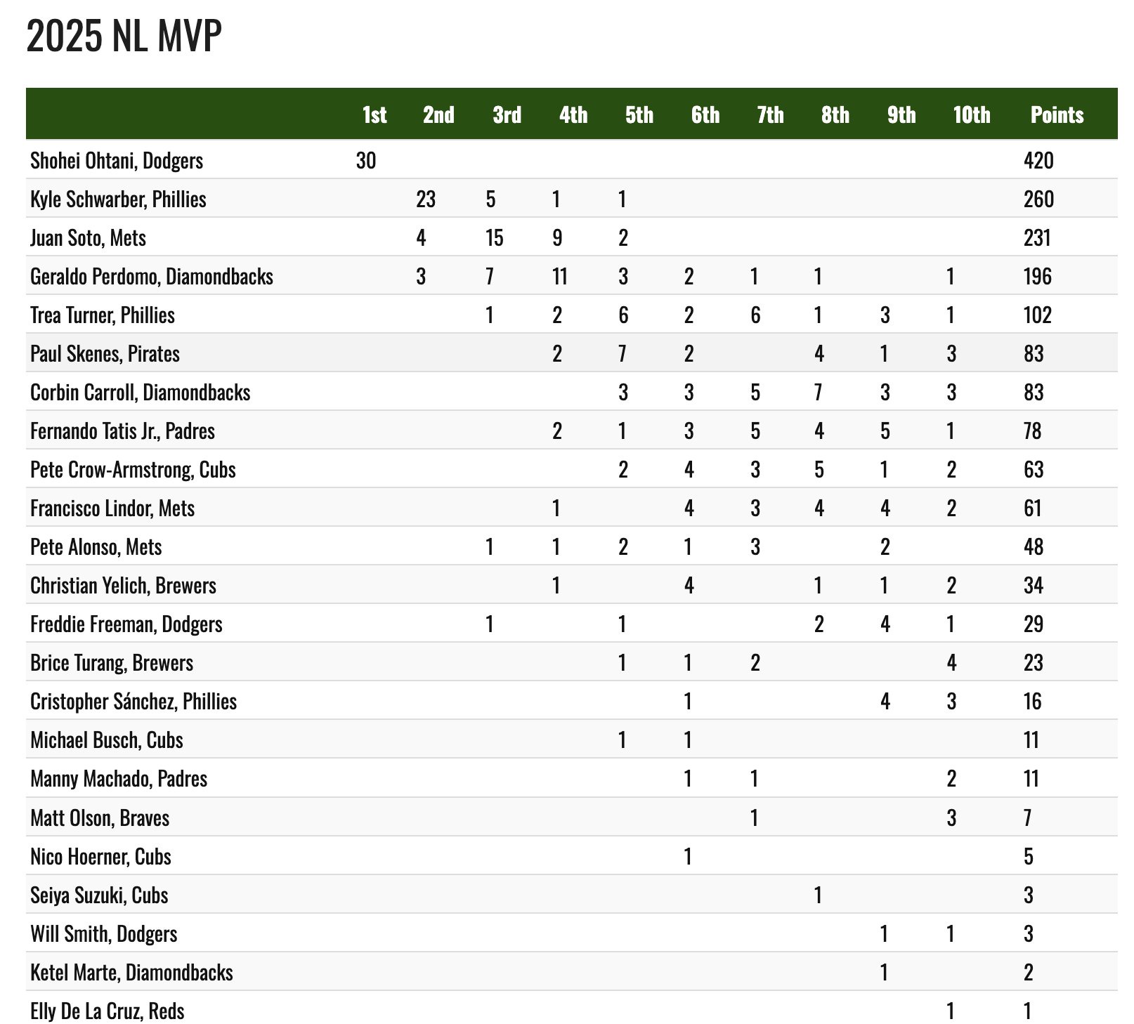 MVPは全米野球記者協会(BBWAA)所属の会員30人が投票し、大谷は初受賞の21年と23年、24年同様、今年も全員が1位票を投じる“満票”でMVPに輝いた。“満票MVP”の複数回受賞はメジャー史上大谷1人のみで、自身の記録をさらに更新。