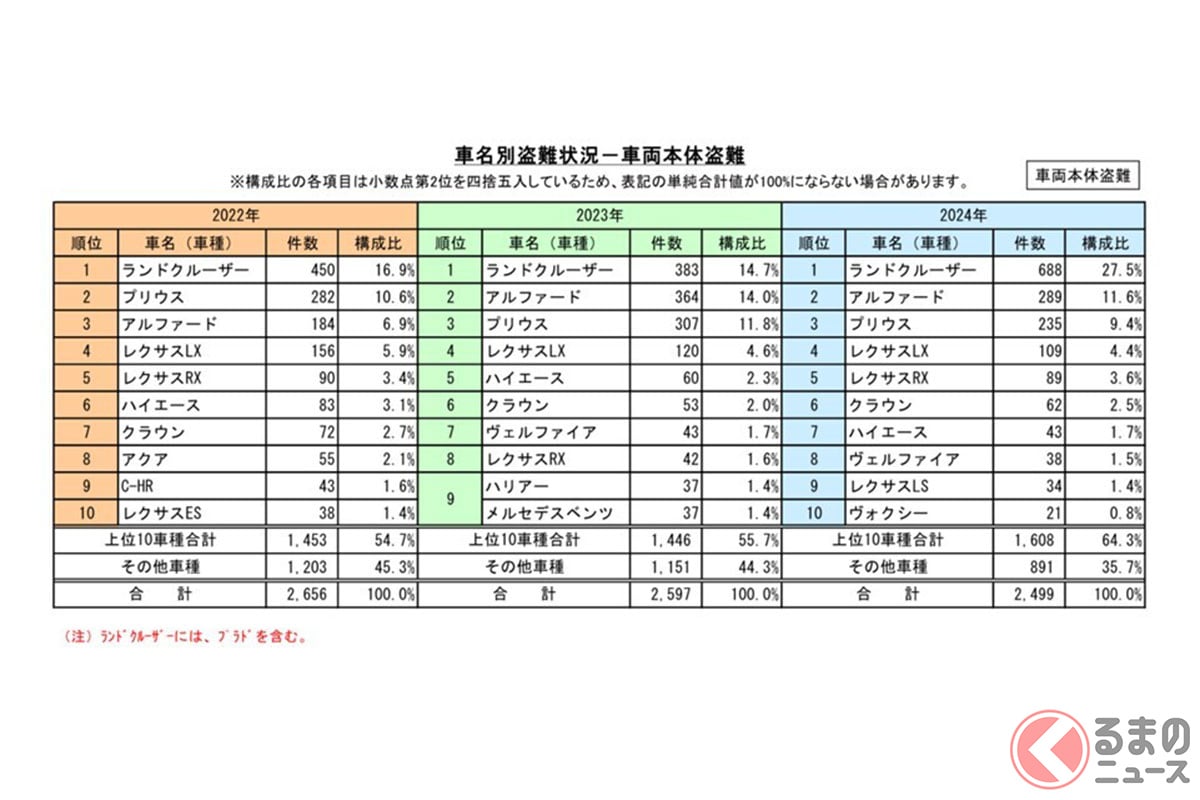ブラジル国籍の男がトヨタ「ランドクルーザー」窃盗の疑いで“通算4度目”の逮捕! 「強制送還しろ!」「刑罰が緩すぎる!」意見も! 一向になくならない「自動車盗難」の現状は? …日の午前1時頃、男が他の人物と共謀して住宅からトヨタの高級SUV「ランドクルーザー」1台(時価1000万円相当)を盗んだものです。 男は東京方面へ逃… (出典:くるまのニュース) |