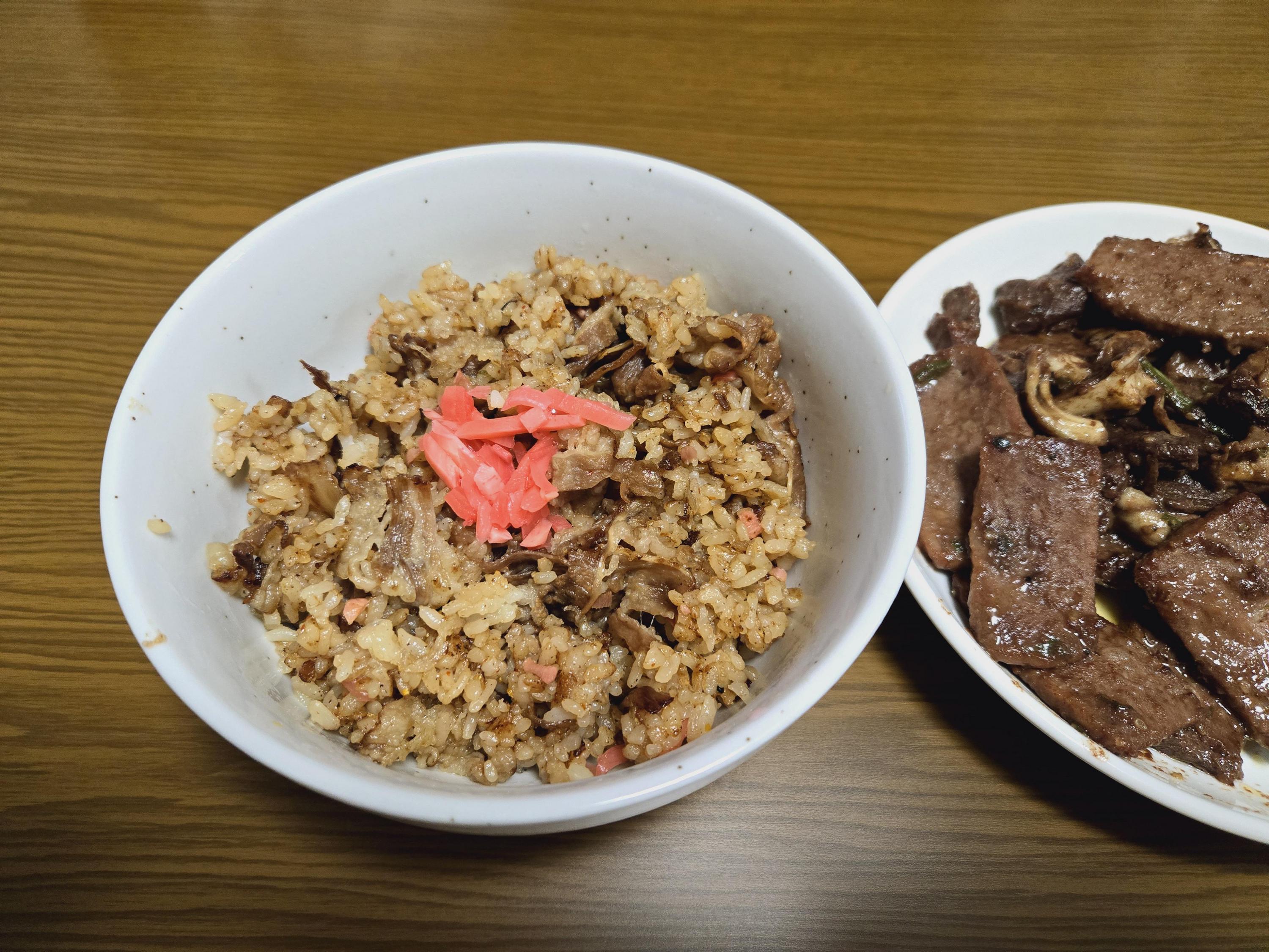 牛丼炒飯の方は牛丼チェーンの牛丼の肉だよ