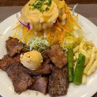 こちらのステーキは、とにかく店名通りにガーリックが全面に押し出されています。サラダのドレッシングもガーリック全開のクリーミーさでした。そんなワイルドな味付けをご飯に合わせて食べやすいように、ステーキは一口サイズにカットされています。「日本で生まれたご飯に合うステーキ」とのこと。
