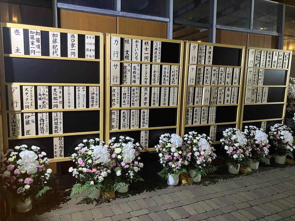 献花には将棋界から藤井聡太6冠、伊藤匠2冠といった現役タイトルホルダーや、中原誠十六世名人、谷川浩司十七世名人らの名前が。芸能界からもお笑いコンビ「ナインティナイン」、マツコ・デラックス、瀬戸康史、「南海キャンディーズ」山里亮太らから多くの花が贈られた。