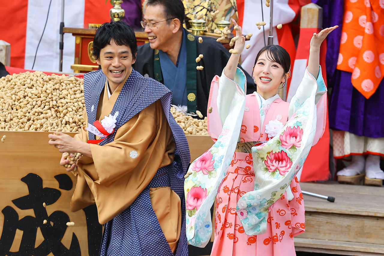 参拝客から「寧々様~」と声が掛かる中、特別参加年男として巨大な千升大福枡から落花生をまいた2人。池松は学生時代の野球経験を生かした見事な投球を披露し、豆まき用に区切られたエリアの外側まで落花生を届かせて大歓声を浴びた。浜辺はその飛距離に驚き、関係者から「いい肩してますね~」とほめられ、照れ笑いを浮かべる場面も見られた。