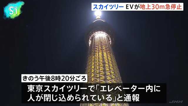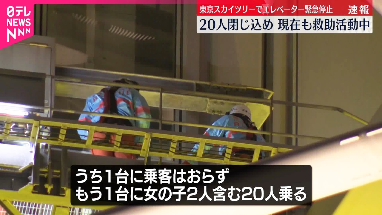 東京スカイツリーのエレベーターが緊急停止 20人が約6時間閉じ込め…救助方法は? カズレーザー氏「今回がまれなケースか、どこでも起こりえることなのか」 …22日、午後8時15分頃、東京・墨田区にある「東京スカイツリー」のエレベーターが地上30m地点で緊急停止し、子ども2人を含む男女20人がエレベーター… (出典:FNNプライムオンライン) |