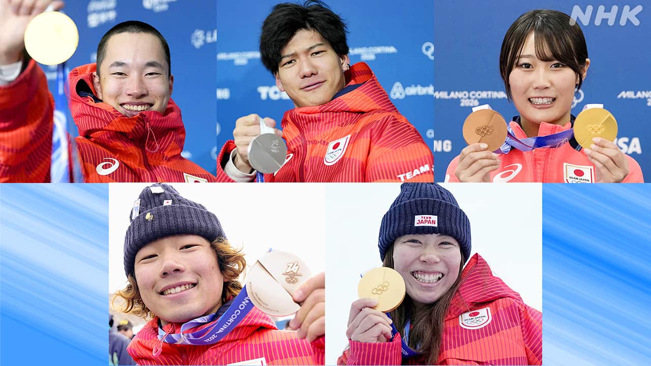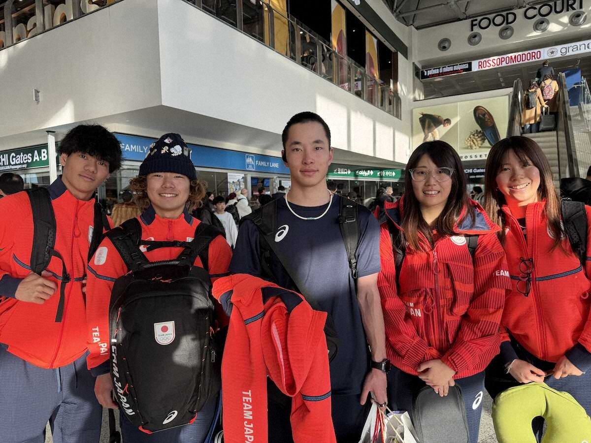 ミラノ・コルティナ五輪のスノーボード女子ビッグエア(BA)金、スロープスタイル(SS)銅メダルの村瀬心椛(ここも、TOKIOインカラミ)、同SS金の深田茉莉(ヤマゼン)、男子BA金の木村葵来(きら、ムラサキスポーツ)、同BA銀の木俣椋真(ヤマゼン)、同SS銀の長谷川帝勝(たいが、TOKIOインカラミ)が22日、成田空港着の航空機で帰国した。