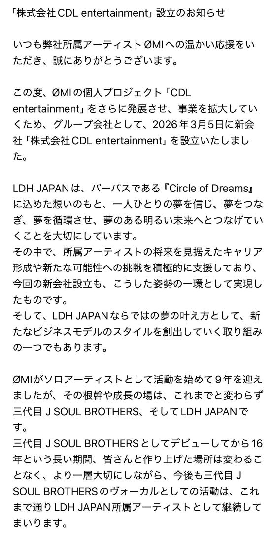 @hakizi24返信先:@oricon OMI(登坂広臣)の新たな一歩。 LDHが会社設立を発表。 「コミュニケーションの場を作れたら」とコメント✨