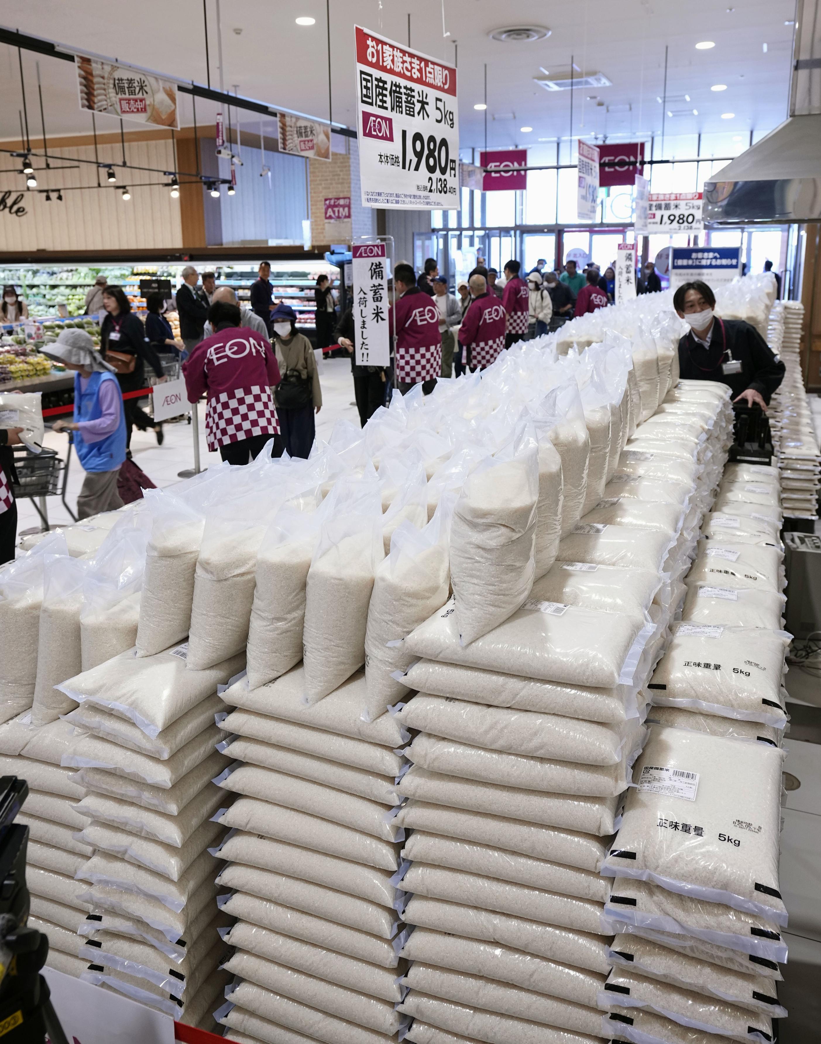イオンは2022年産の備蓄米2万トンを随意契約で購入していて、この店舗ではきょう、5キロ2138円(税込み)で4800袋を販売します。